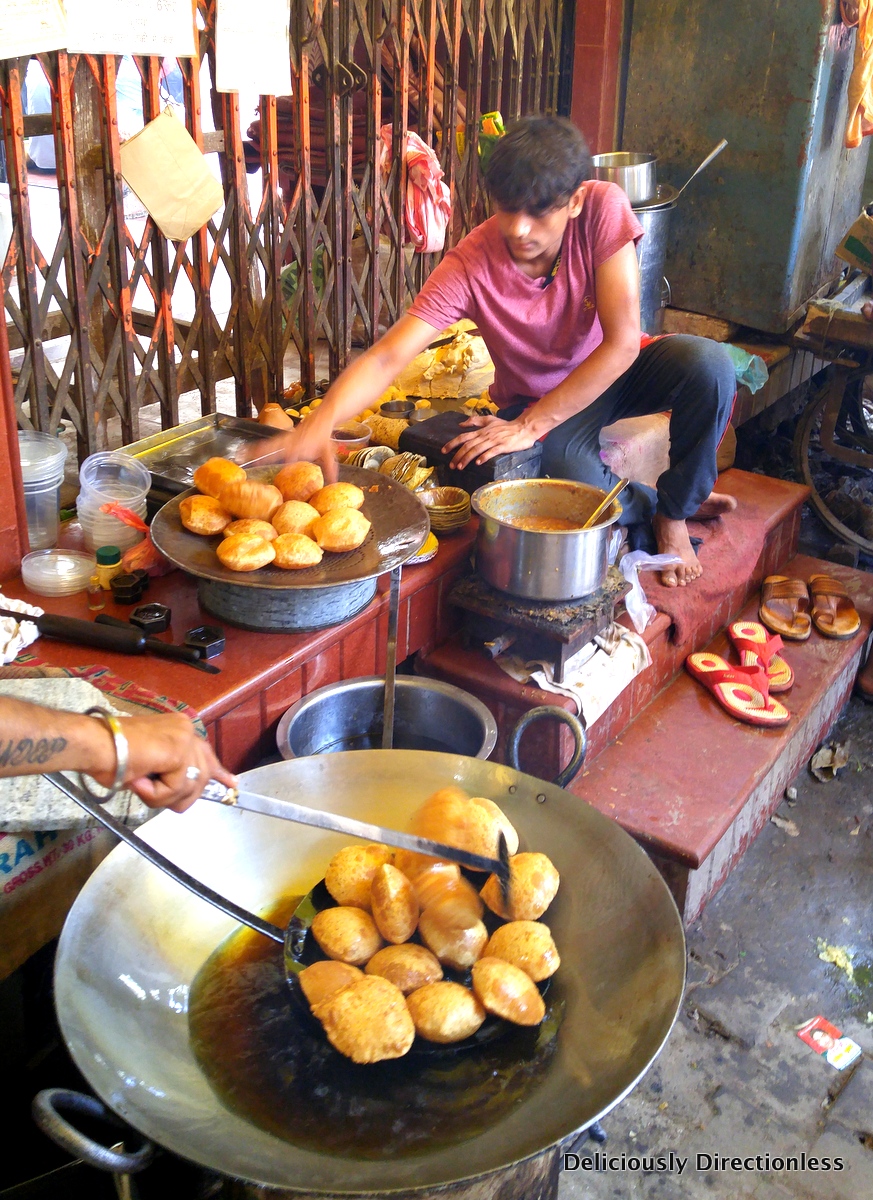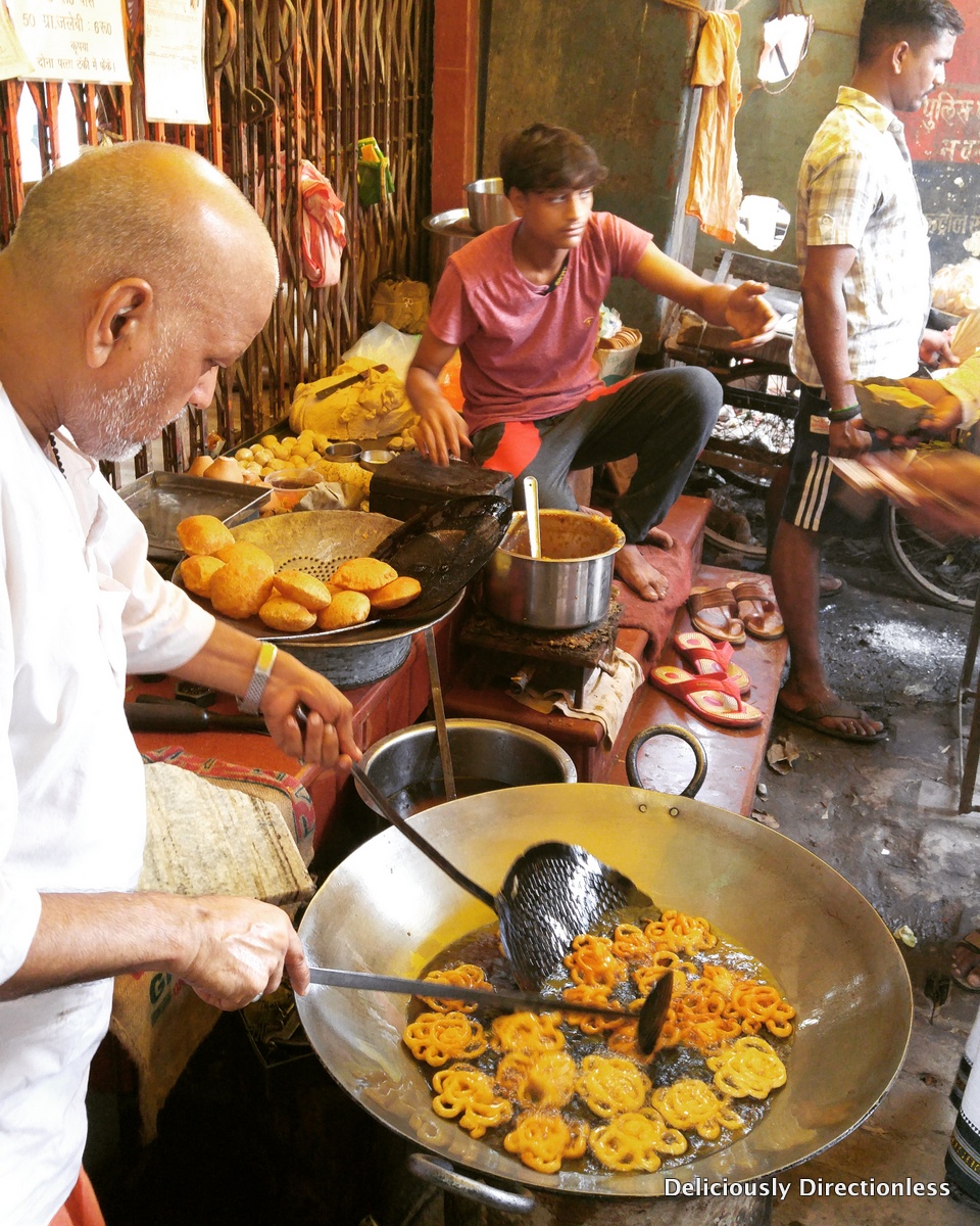 That done we proceeded to hunt for breakfast. It was a bit past 11 a.m. so many of the kachori vendors were already sold out, but I was in search of Babu Lal Kachori Wala who apparently sets up shop every day around 10 a.m. at the entrance of Kachori Galli near the Kashi Vishwanath Temple. And he was exactly where my friend had said he would be. He was out of jalebis but seeing my crestfallen face he said that he was just about to make a new batch. Is there anything better than piping hot jalebis, just fried and dunked in sugar syrup?!