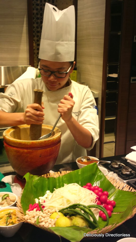 We were handed three recipes and directed to ‘The Kitchen’ – a well-equipped studio kitchen with an elegant dining area attached. The kitchen island was large enough to accommodate 8 workstations. We were joined by the better halves of the Thai Consul General & Four Seasons’ General Manager in our cooking adventure. Chef Seefah began by explaining the basics of Thai cuisine – how sweet, sour and salty tastes combine in harmony to create a balanced flavour.