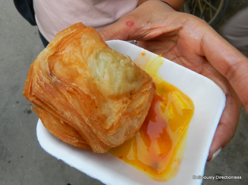 next to Gurdas Ram was a street vendor selling saatpuda – flaky puffs with a savoury filling, served with a sweet