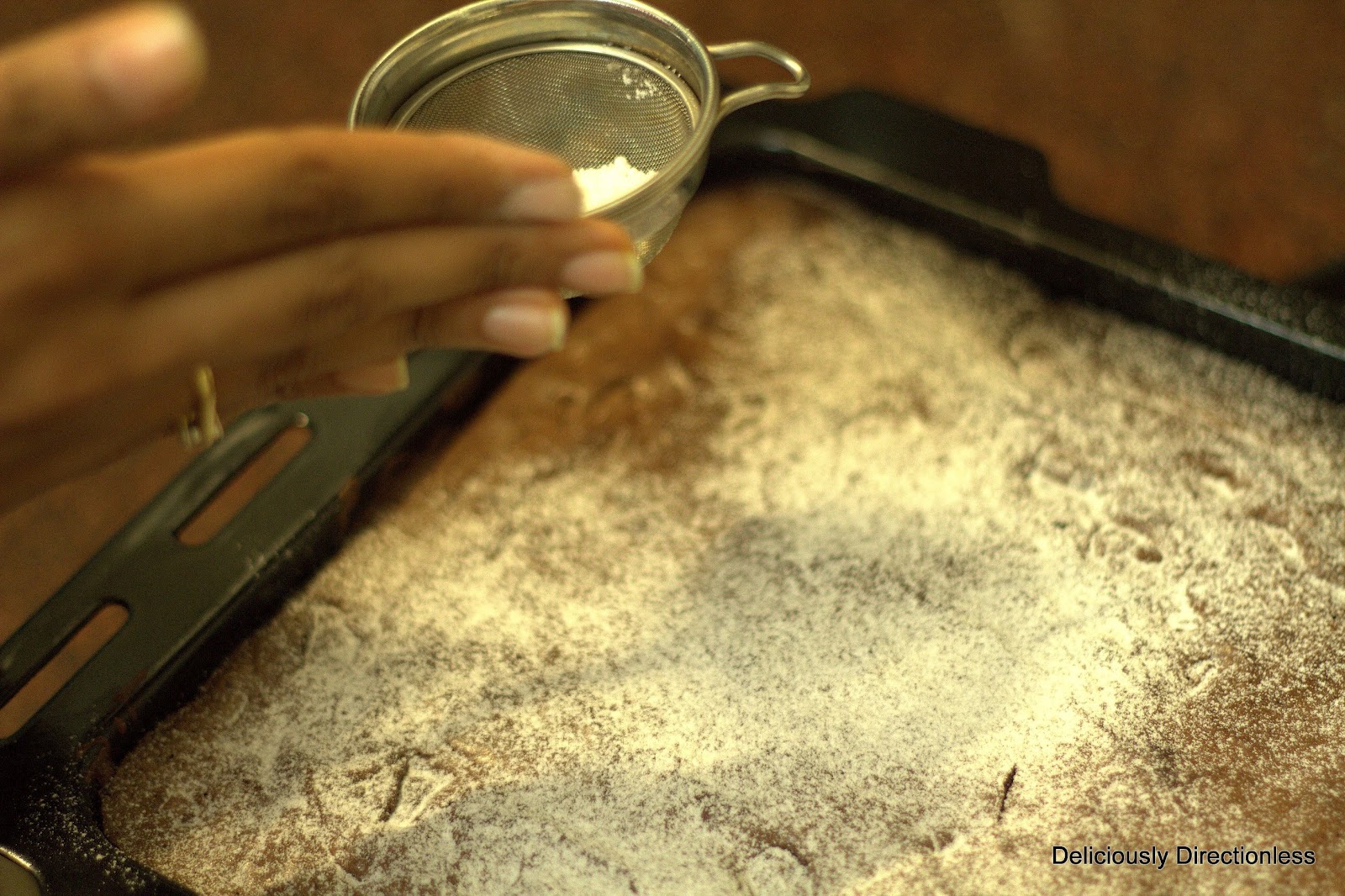 Grease a 9”X9” square tin (or an 11”X7” rectangular one) and sprinkle some