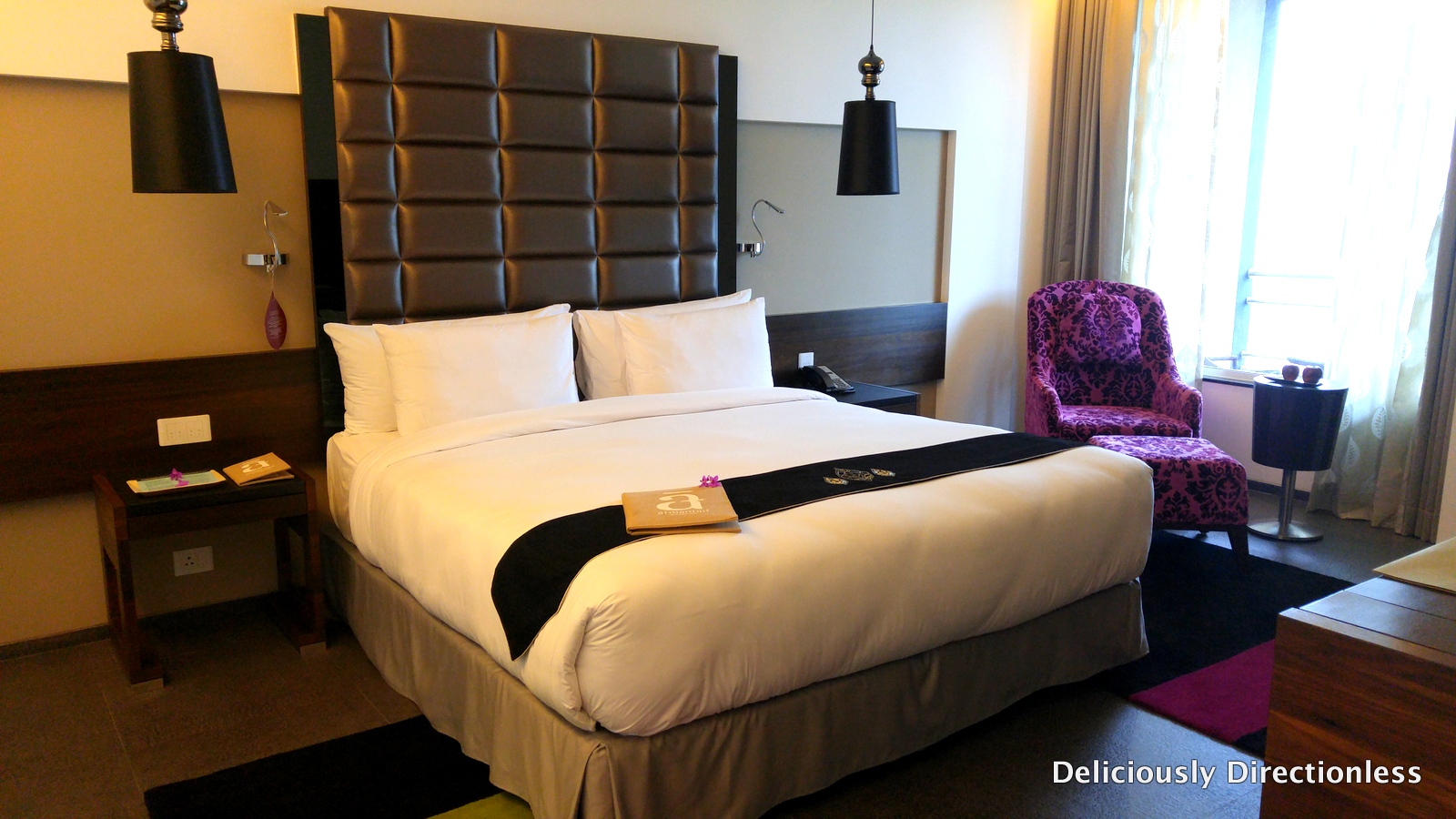 After downing a warm spinach welcome drink (wellness begins right at the entrance), I was whisked to my room in the Arjuna Grove. The big comfy bed beckoned as did the sunken bath next to the window. I loved the floor to ceiling windows that bathed the room in natural light. I stepped outside to the attached balcony and spent some time lounging in the chair watching the rain fall softly. My favourite part of the room was the big purple chair and ottoman inside the room – the perfect perch for a cup of herbal tea and a book.